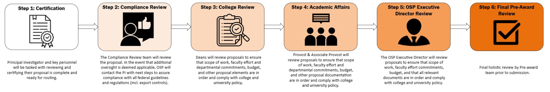 Principal investigator and key personnel (Co-PI, Co-I, etc.) will be tasked with reviewing and certifying their proposal is complete and ready for routing. Once all key personnel on the team have certified the project proposal, the proposal will be routed to the second step.