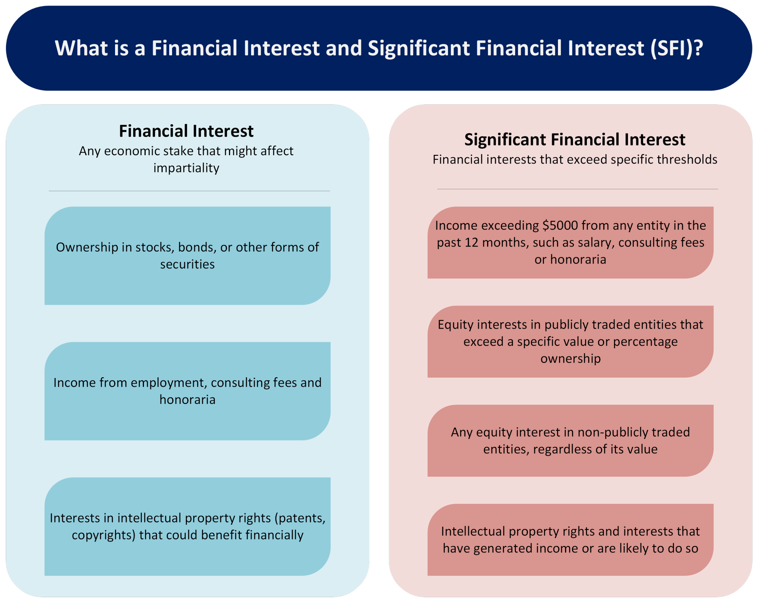 A significant financial interest (SFI) is a specific subset of financial interests that are substantial enough to raise concerns about conflicts of interest. An SFI is typically defined by thresholds outlined in the policy, which could include, but are not limited to: